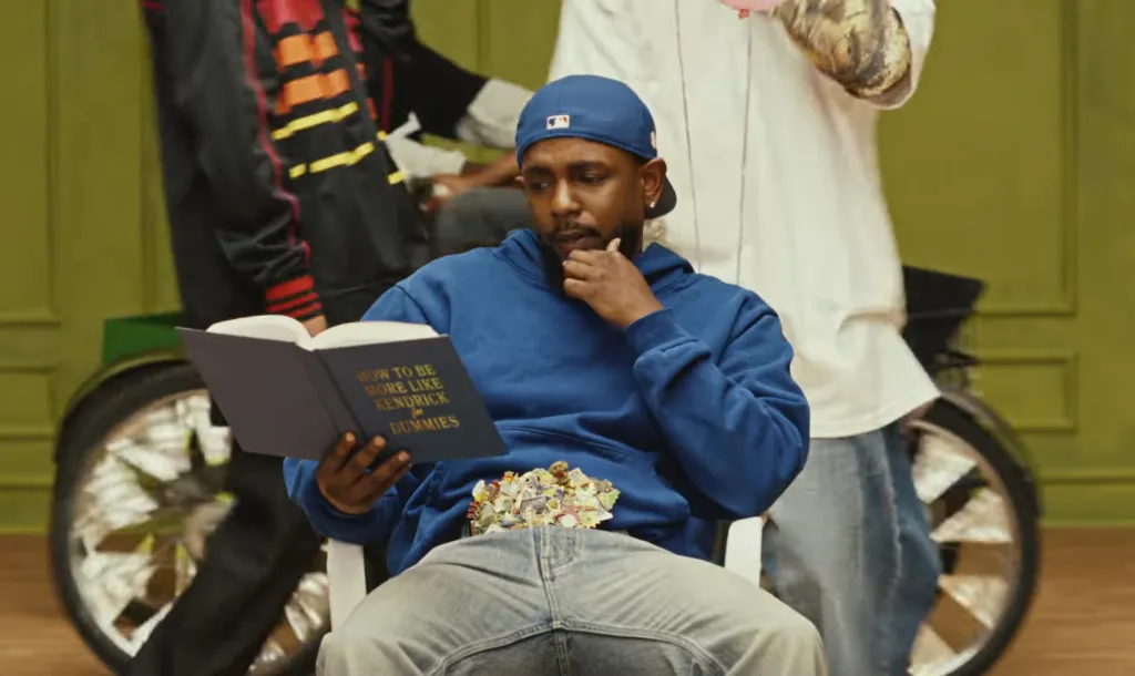 In the under-three-minute visual, Lamar dons a “dodger blue” ensemble, perfectly embodying his iconic style. The video plays with rival gang themes, drawing attention to Compton’s rich cultural history. Kendrick humorously trolls viewers by reading a book titled, “How To Be More Like Kendrick For Dummies,” while also referencing classic Soul Train moments and early 2000s mall photoshoots.